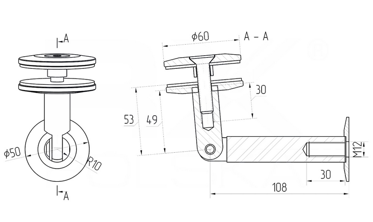 Mocowanie płyty szklanej z ścianą - dolne, el. daszka DS01