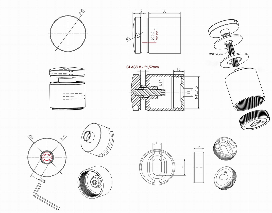 Uchwyt punktowy do szkła ø50mm dystans 50mm z regulacją M10, ot. w szkle 20mm, AISI 304, SZLIF